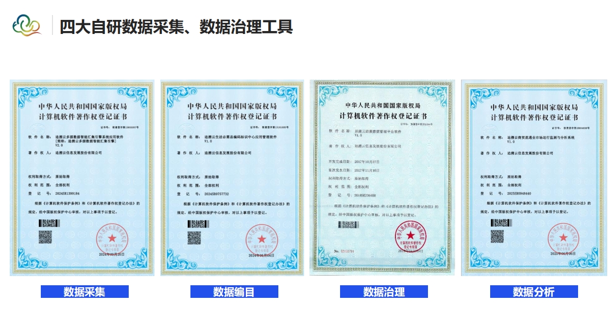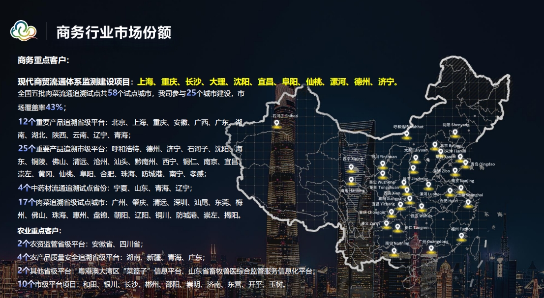 追溯云信息发展股份有限公司定位为中国领先的供应链数据服务运营商,核心技术涵盖北斗、AI大模型、大数据、物联网、区块链、云计算等前沿领域。十五年来,我们始终聚焦食品安全追溯这一赛道,参与了全国多批肉菜流通追溯试点城市建设,重要产品追溯省级/市级平台覆盖多个省市。